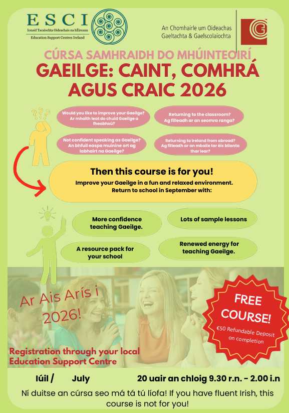 Cuir le do mhuinín i labhairt agus i múineadh na Gaeilge le Gaeilge: Caint, Comhrá agus Craic 2026! Cúrsa samhraidh taitneamhach agus tacúil a chabhróidh leat do chuid Gaeilge labhartha a fheabhsú, smaointe praiticiúla don seomra ranga a fhiosrú, agus acmhainní úsáideacha a fháil. Fill ar scoil le fuinneamh agus muinín nua!